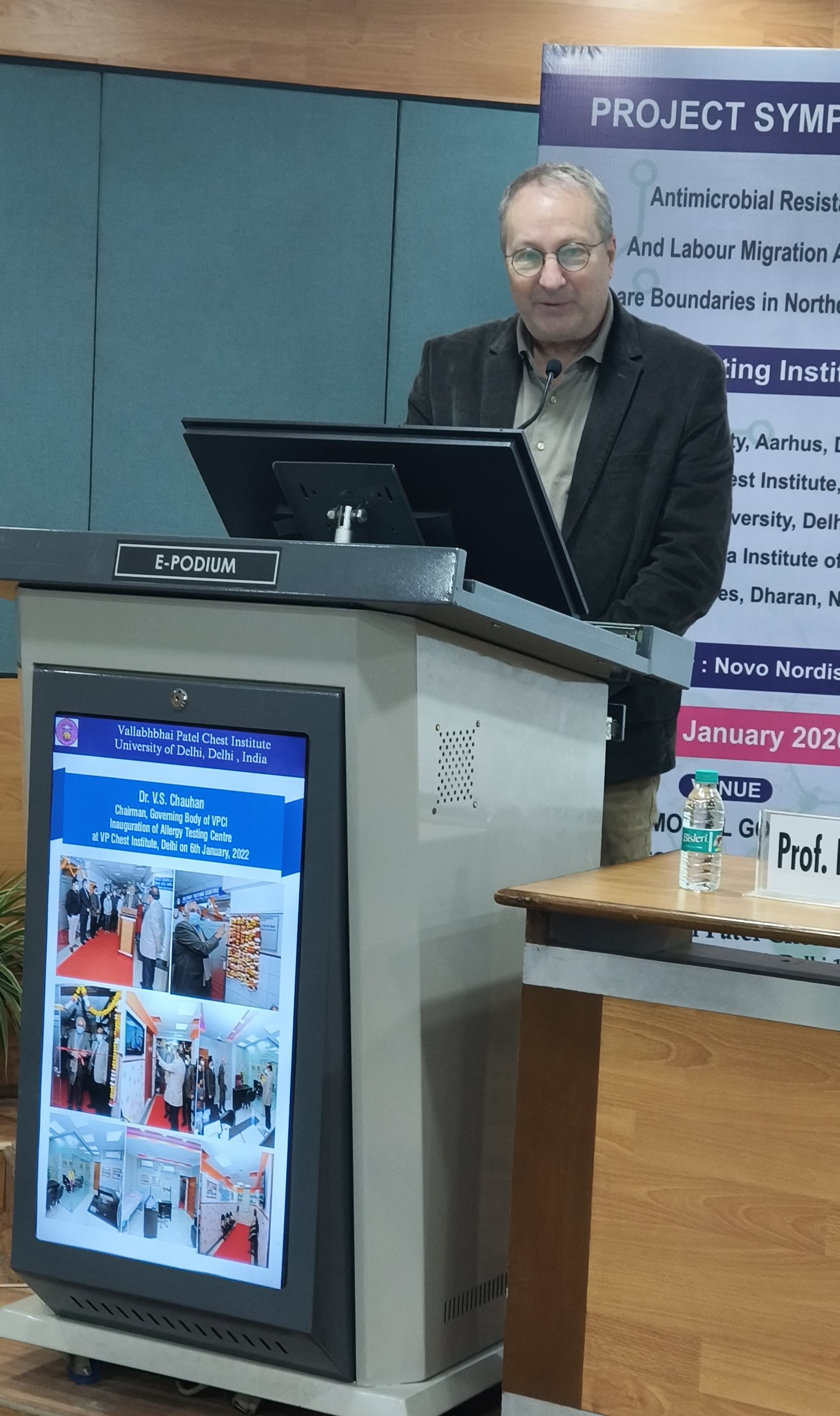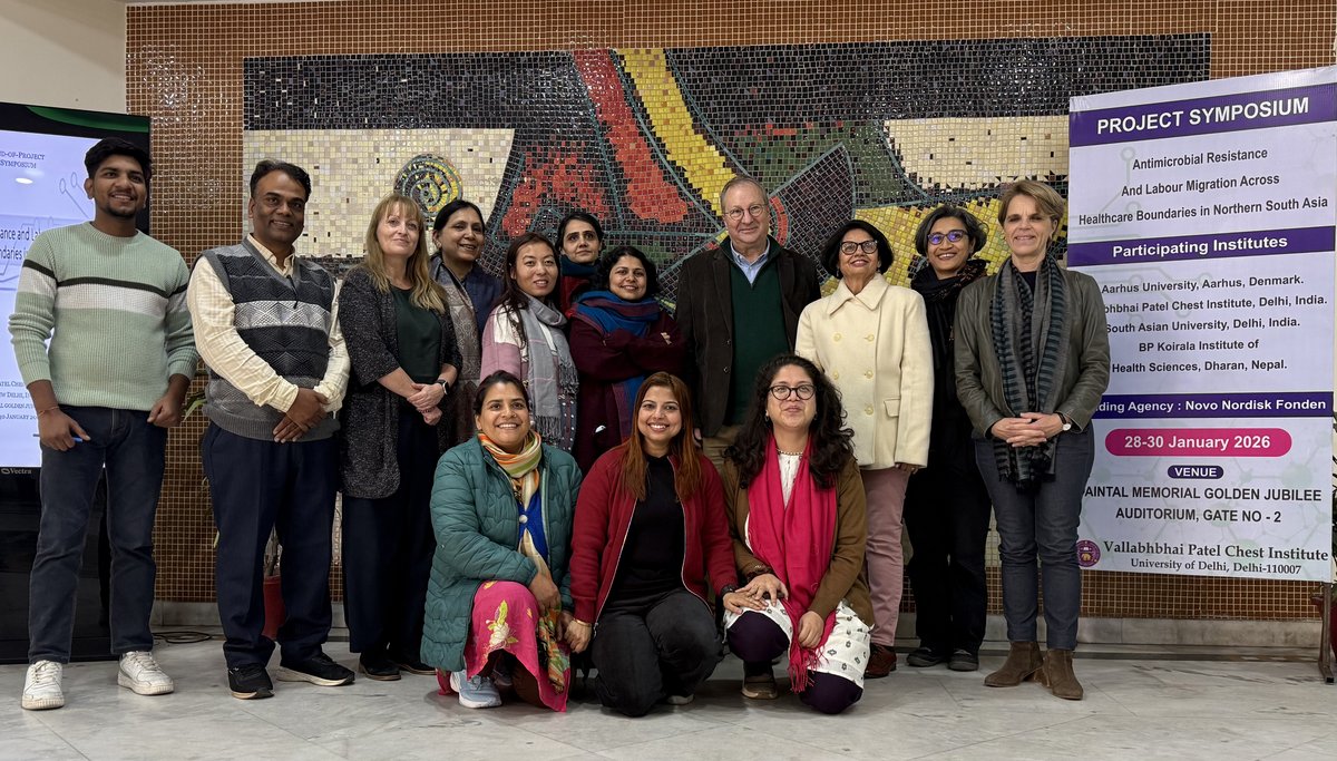 The End-of-Project Symposium was hosted and organized by the Vallabhbhai Patel Chest Institute (VPCI) in New Delhi, India. All project teams from Denmark, India, and Nepal participated, along with members of the Scientific Advisory Board (SAB): Robert Leo Skov from the International Centre for Antimicrobial Resistance Solutions (ICARS); David Napier from University College London (UCL); Ellina Samatroy Jena from the V.V. Giri National Labour Institute (VVGNLI); Morten Sodemann from the University of Southern Denmark (SDU); and Rajib Dasgupta from Jawaharlal Nehru University (JNU).