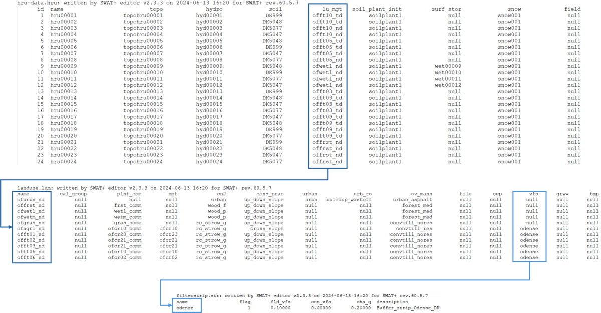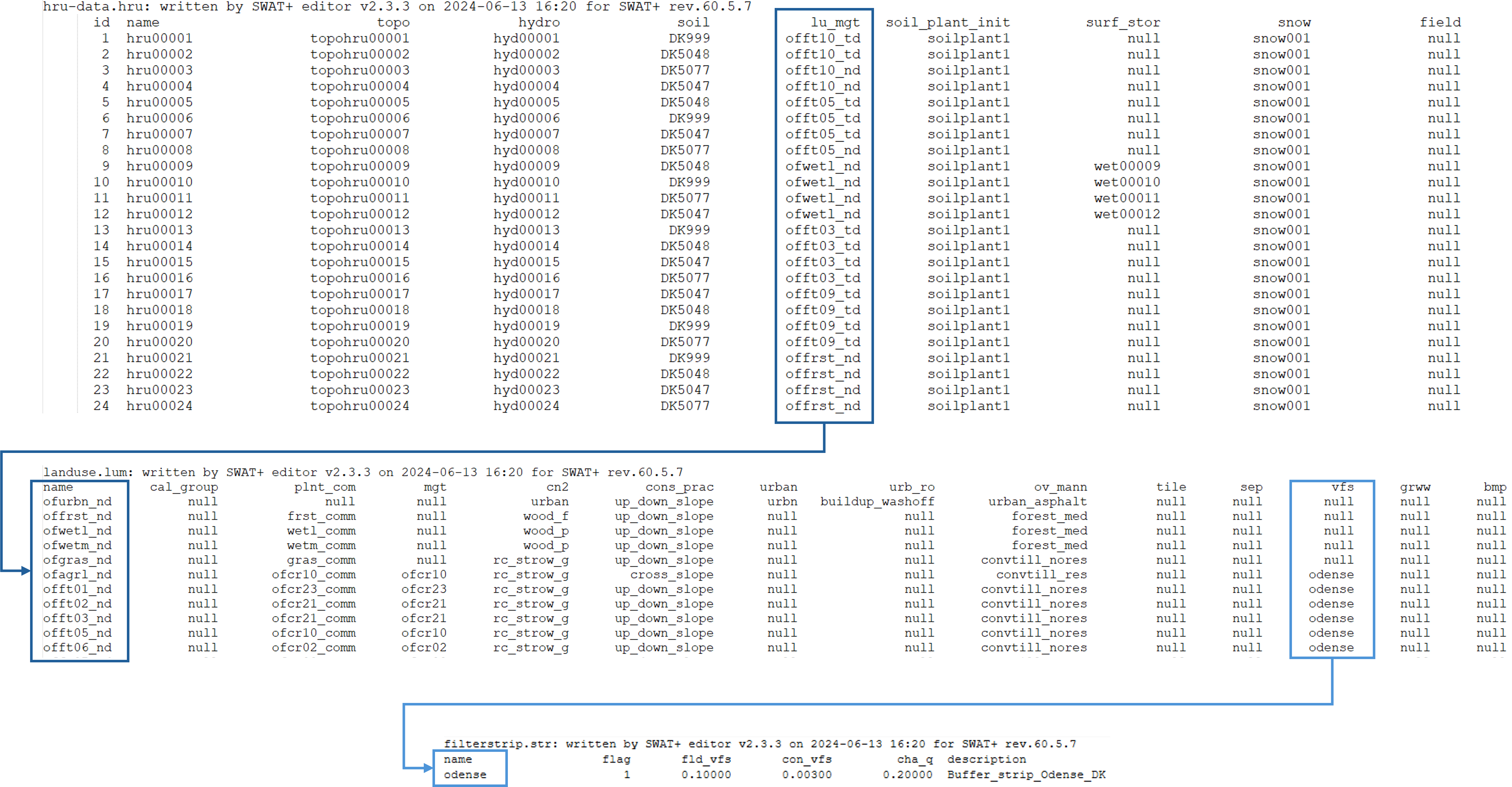 In NORDBALT-ECOSAFE, the following input files were edited to implement buffer strips in SWAT+:
