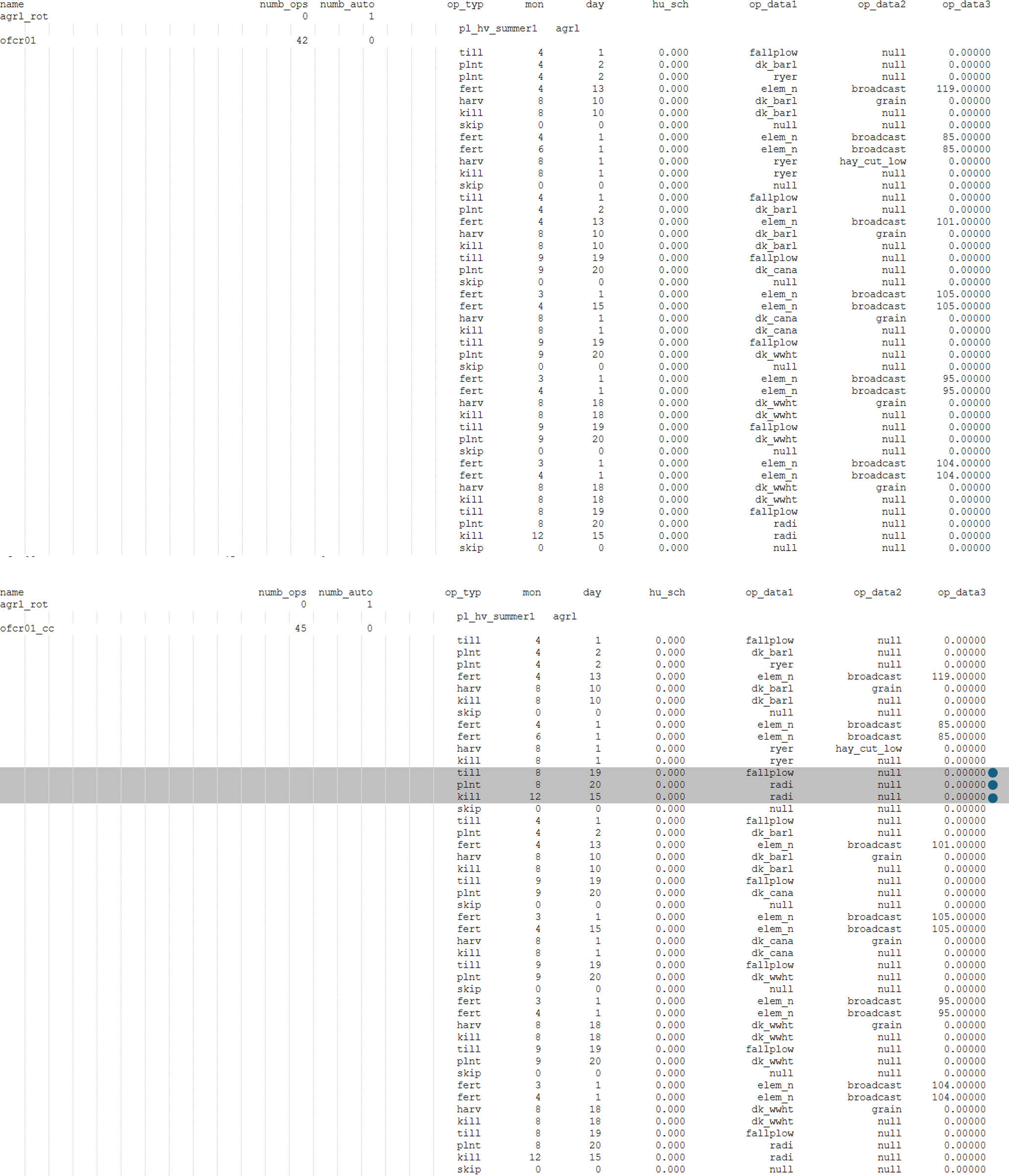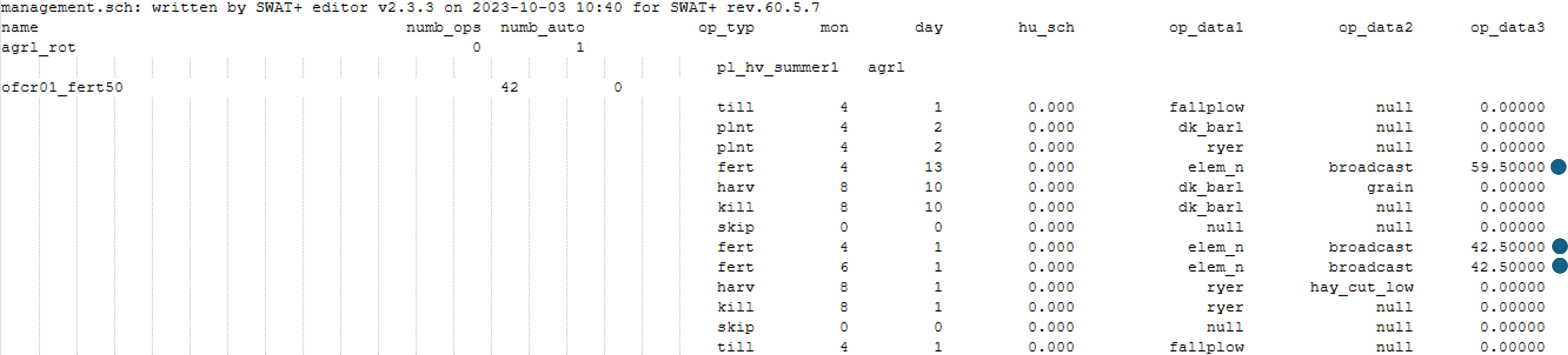 Tip: Instead of making changes in the original management.sch file, create a copy, make the desired changes, and save it under a different name. Then, change the name of the file in file.cio. Keeping both the original and modified management files allows you to easily switch between baseline and scenario runs without losing the original setup. When using Decision Tables, it is recommended to create a copy of the DT of interest in lum.dtl and change the name in a copy of management.sch accordingly. Remember to update the total number of DTs in the second line of lum.dtl when adding new DTs.
