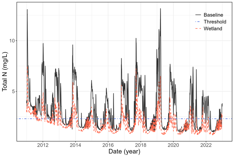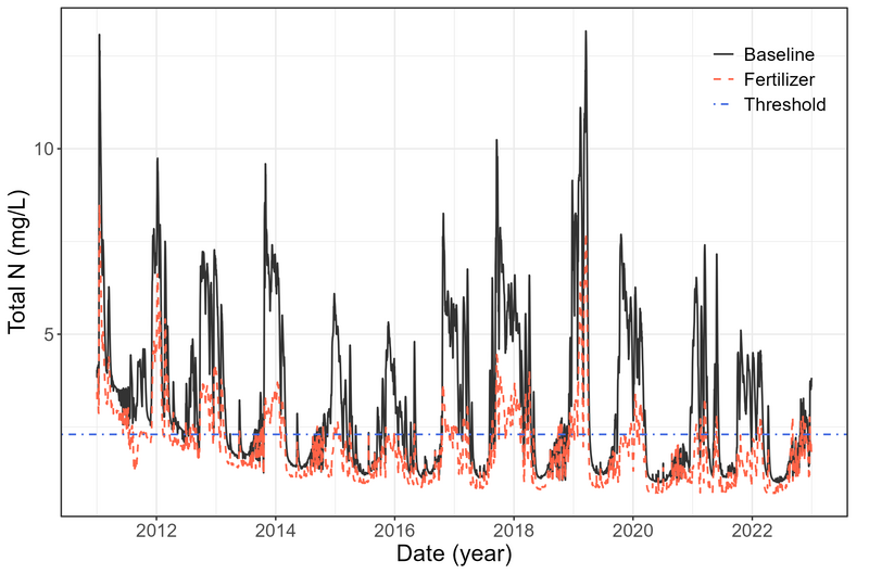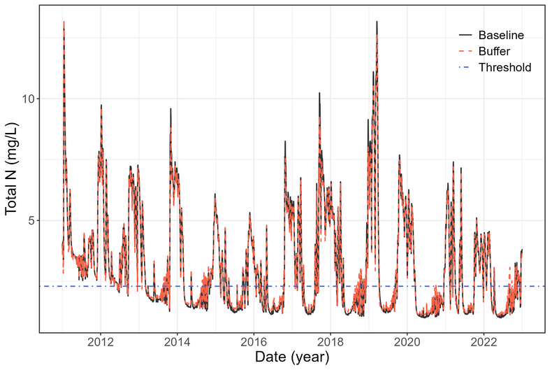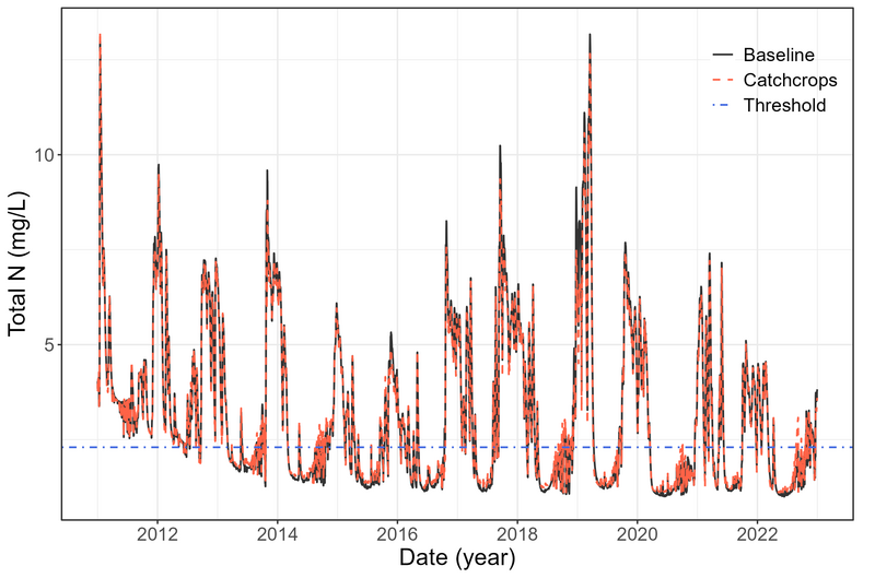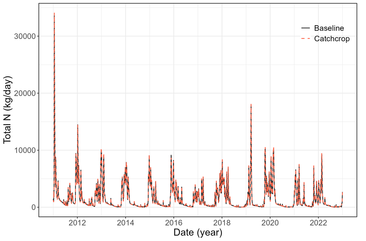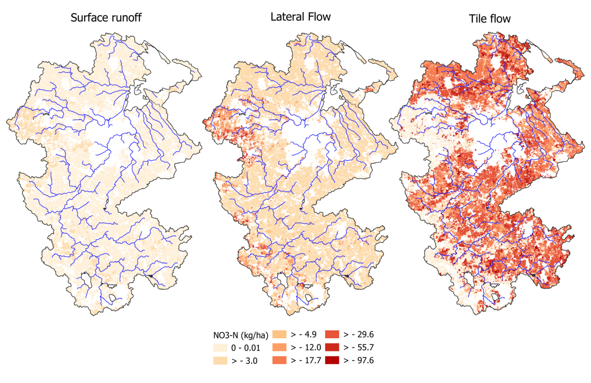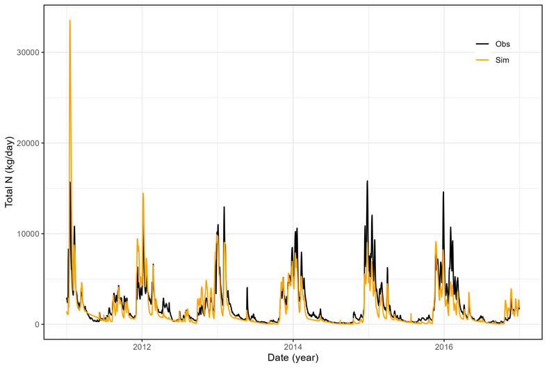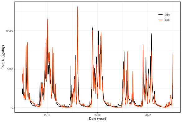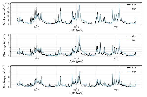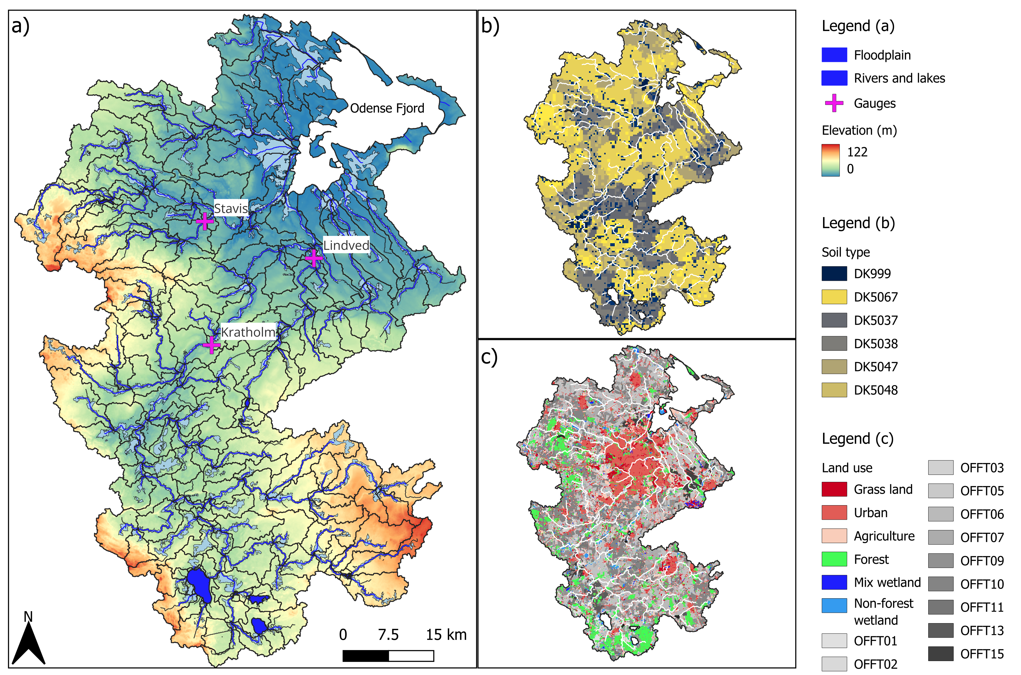 The calibration and validation of daily discharge and total nitrogen was performed at three gauges for streamflow and one gauge for total nitrogen: Odense Å at Kratholm (discharge and total nitrogen), Stavis Å (discharge), and Lindved Å (discharge).