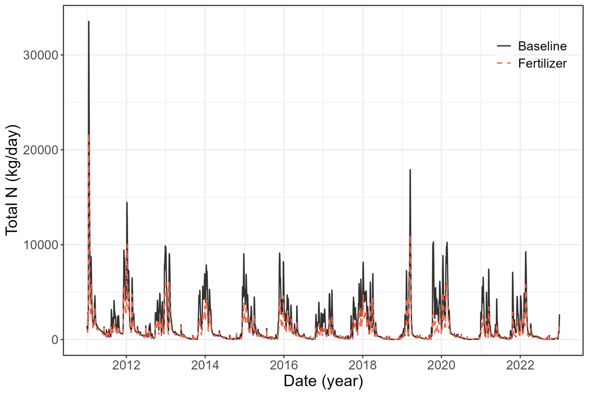 Recall files with flow data were added for the 10 largest wastewater treatment plants. Each point source was connected to its nearest channel.