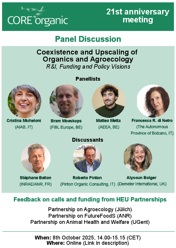 On 8 October 2025, CORE Organic hosted an online 21st anniversary meeting to celebrate the CORE Organic network's 21 years anniversary. This occasion was used to reflect on the achievements since 2004 and to engage in fruitful discussions on the coexistence and upscaling of organics and agroecology. The inspiration for these discussions were given by a panel consisting of voices from both within and outside the network, offering valuable perspectives and inspiration.