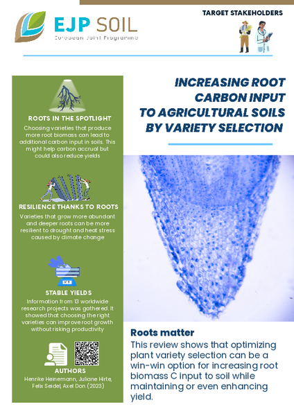Choosing varieties that produce more root biomass can lead to additional carbon input in soils. This might help carbon accrual but could also reduce yields