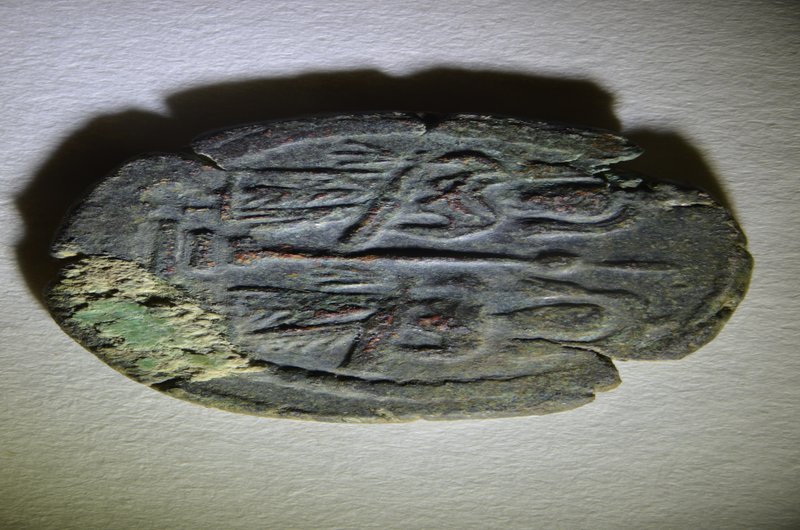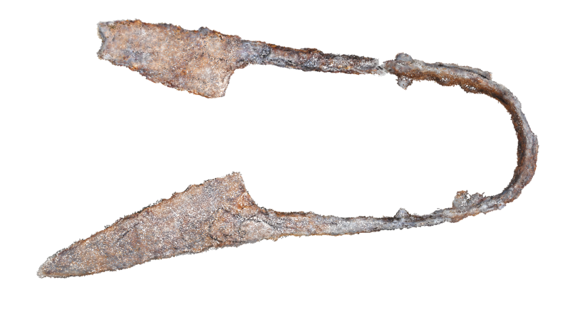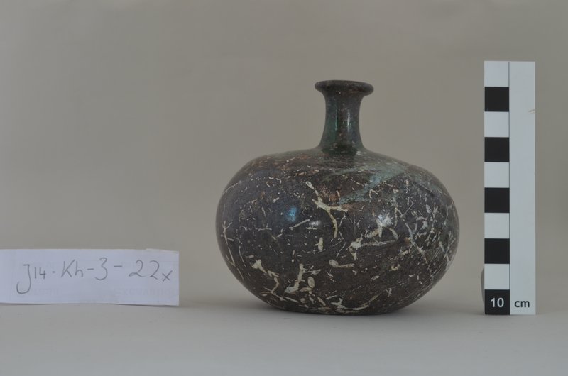 The excavated structures in trench K were comprised of two connected rooms whereof the easternmost room connected to yet another front room or courtyard in which a mortared rock-cut water channel covered by large stones running north-south through the easternmost part of the trench was discovered. To the north of the westernmost room part of another room was excavated. This room did not seem to bear any direct relation with the westernmost room of the trench. Bedrock was reached in many sectors. In the easternmost room of the trench Abbasid pottery was found, which until now has been fairly rare in Jerash. In the westernmost room a concentration of finds came to light, which included an Arab-Byzantine coin hoard of 11 coins, among these a rare specimen of a coin minted in Beisan during the early Islamic period (fig. 11). Furthermore a number of iron and bronze items which seem to have belonged to an assemblage came to light (fig. 12). The items almost all are connected with textile production and sewing. They include needles for rough materials, Byzantine weights, spindle whorls and files. In the northeastern corner of the trench several larger metal objects were found, among these a flax heckle, again indicating a connection to textile production and the working of raw materials. The concentration of Byzantine/early Islamic period finds seem to have fallen down during the collapse of a second story. Furthermore several complete glass flasks (fig. 13) were found, also belonging to the collapse of the upper story of the building. The associated pottery points to an early Islamic date.