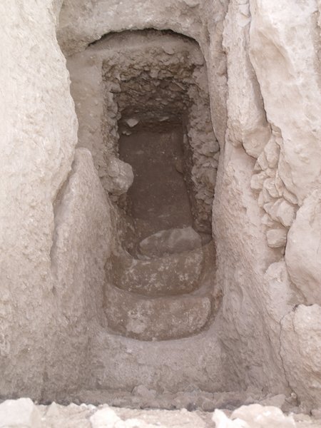 The trench was laid out as a 5 meters by 5 meters square trench catching the inside of the terrace, the terrace wall as well as the outside of the terrace to the south where another wall was running east-west (fig. 7). Between the wall located outside of the terrace and the remaining area to the south bedrock was soon reached. However, the bedrock turned out to be cut deep down to a depth of 5 meters. The fill from surface to the bottom of the cut bedrock was full of pottery dating to mainly between the 3rd and 5th centuries CE. The fill was extremely dense and there was more pottery than soil in some of the layers. At the level of app. 4 meters three cave structures were encountered, which were also completely filled up intentionally. Towards the west a staircase ascended, which was also cut into the bedrock (fig. 8). The full length to the surface of this staircase was not excavated due to the lack of time, but it is assumed that it led all the way to the surface. The cave structures to the north and the west were not very large and partly natural partly artificial. In the area in front of the three caves two fire places came to light. An entrance to a larger cave complex was encountered at the south side where a door opening was situated. This door opened a short corridor leading to a large open cave room on a lower level. In the ceiling of the corridor a shaft opened that led to the surface. The corridor had been blocked with walls and filled in from above through the shaft. This fill contained mainly material from the 6th/7th centuries CE.