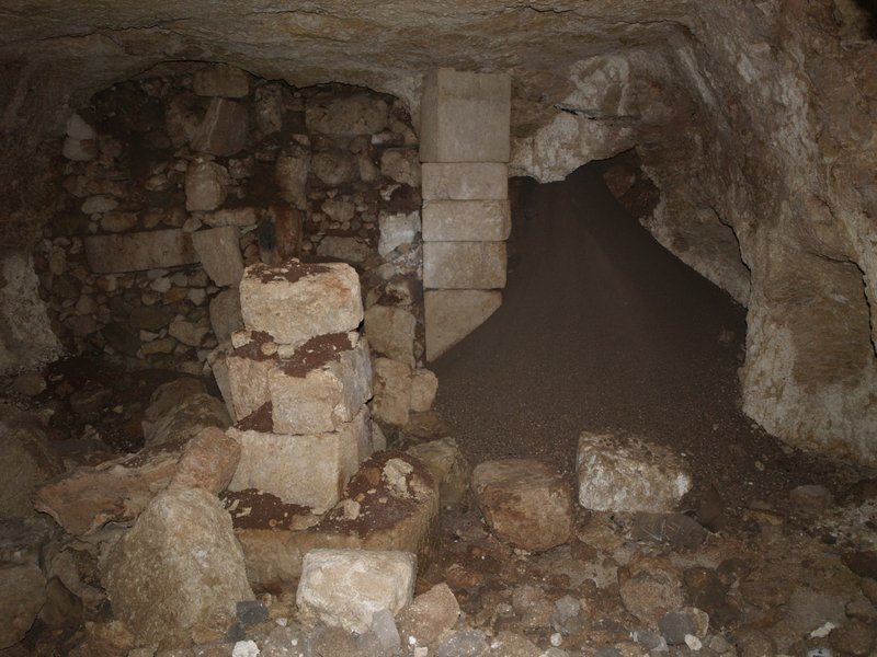Behind this fill a large cave, partly natural and partly worked came to light. It measured app. 7.5 meters by 6.5 meters (fig. 9). On the west side it had three roughly worked niches, on the east side it was vertically worked and on the south side it was blocked completely up by an artificially constructed back wall. Within the back wall a blocked door is visible that probably led to another room to the south. App. in the middle of the back wall stood a support pier which was constructed by several well-worked blocks. It had been slightly moved out of place by a collapse in the bedrock which could be detected by a large piece of bedrock which had come partly loose and was pressing against the support. Another pier was standing in the center of the cave, but it had partly collapsed. One large mill stone made up the bottom of this central support. Another one was built into one of the courses of the artificially constructed back wall. The cave was fairly void of any finds belonging to the last phase of use, a few pottery sherds were found, but these may have belonged to the fill layers. It seems as if the cave had been cleaned out before it was closed off. There were no traces of the cave having been used as either a grave or as a complex for cultic activities. Rather it seems to have been a complex for domestic or industrial usage, perhaps as a basement for a housing complex on the surface. The complex has two main phases of use.