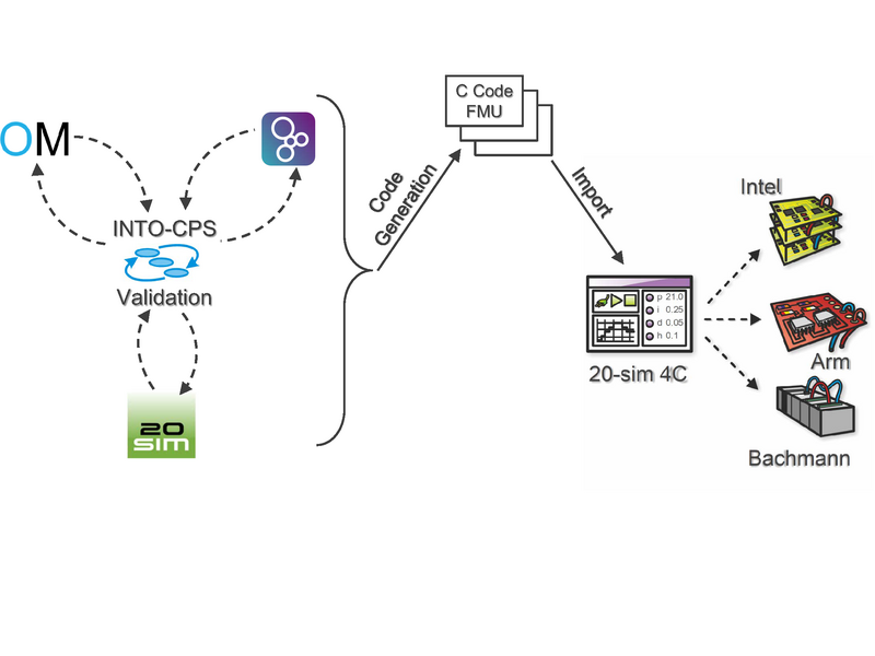 The automatic generation of executable code from models allows for rapid prototyping and development of controller software at a high level of abstraction. Here mathematical and logical techniques, as well as simulation tools, can be employed to analyse and validate models of control software, leaving the implementation to the simple push of a button. With the INTO-CPS tool chain, designers have the ability to automatically generate controller implementations in the C language for embedded platforms such as Raspberry Pi and severely resource-constrained PIC and AVR microcontrollers.