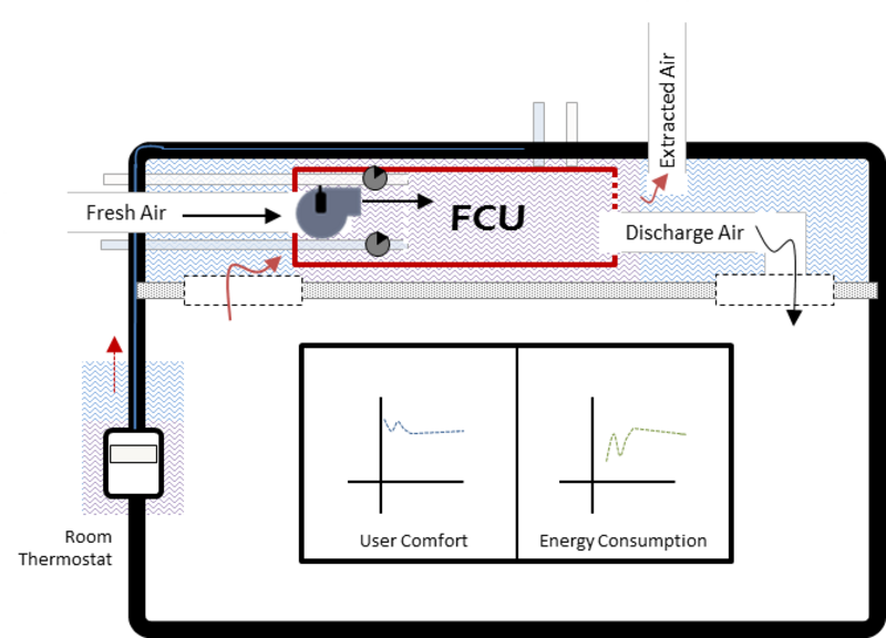 The building use case will focus on modelling and analysis of energy and comfort management of an area inside a building premise. Considering for example a room area, the two main components of the room will be a) the Fan Coil Unit (FCU) and b) the room thermostat. In more detail: