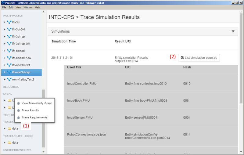 To master the complexity of different models, simulation results, test cases and all the other files that are being generated over the course of a CPS's development cycle, INTO-CPS offers support for traceability. This means that all the tools send information of generated or modified files (such as requirements that are created, connections diagrams that are exported, or FMUs that are compiled) to a central database. The user can then query the database for the connections between the different artifacts. For example, the user can reconstruct from which FMU versions a simulation result was created. This is integrated into the INTO-CPS application and shown in the following figure.