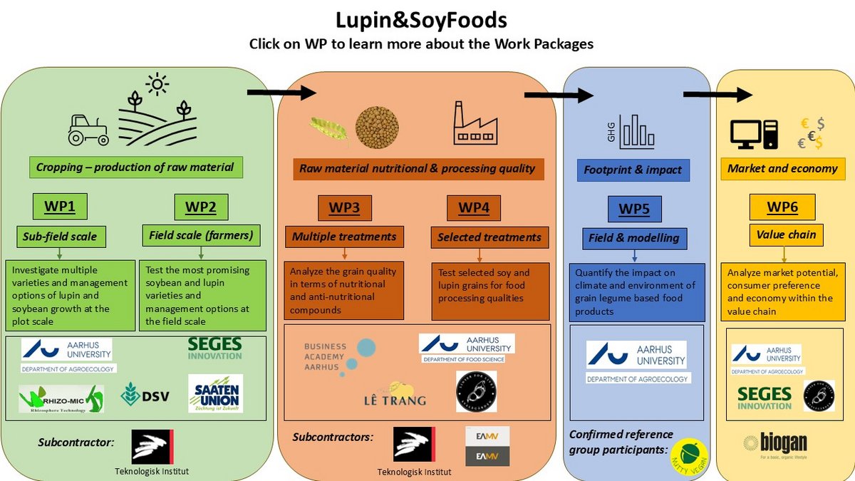 The goal of the project is to establish Danish cultivation of lupin and soya beans for food with good nutritional properties (high protein and oil content, optimal amino acid composition) and low climate and environmental footprint. We work with the entire value chain from cultivation, quality determination processing and sales of lupins and soybeans for human consumption. We aim to optimise the cultivation of lupins and soybeans so that the raw material has a high nutritional content and low levels of anti-nutrients. Additionally, we investigate the processing properties of the raw materials on a laboratory scale and at three food producers, and determine the climate and environmental impact of Danish lupin and soybeans for food food compared to raw materials imported from abroad. The economic impact is determined, and we analyse opportunities and barriers in the value chain to increase market potential through interactive stakeholder workshops to increase the market potential for Danish raw materials of the two legumes.