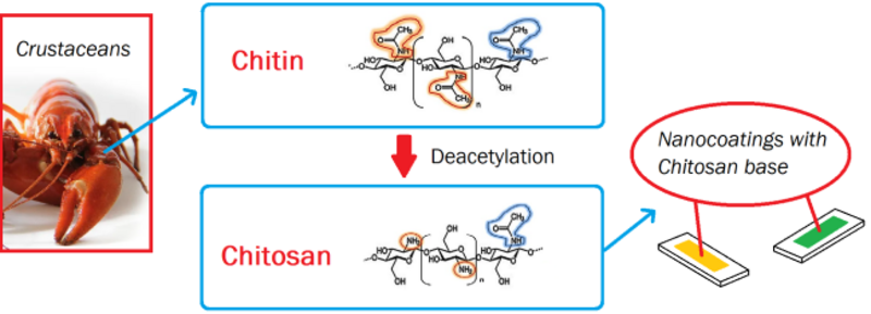 Chitosan derives from the carbohydrate ‘chitin’ found naturally in crustacean shells and can therefore be sourced in wastes from the food processing industry. This makes chitosan a low-cost, bio-safe, and sustainable material. Chitosan itself has antimicrobial properties but is also promising as a base in coatings loaded with nano particles.