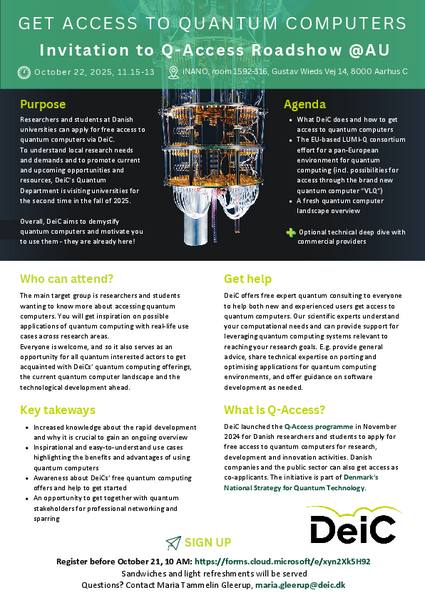 Invitation to Q-Access Roadshow. Researchers and students at Danish universities can apply for free access to quantum computers via DeiC.